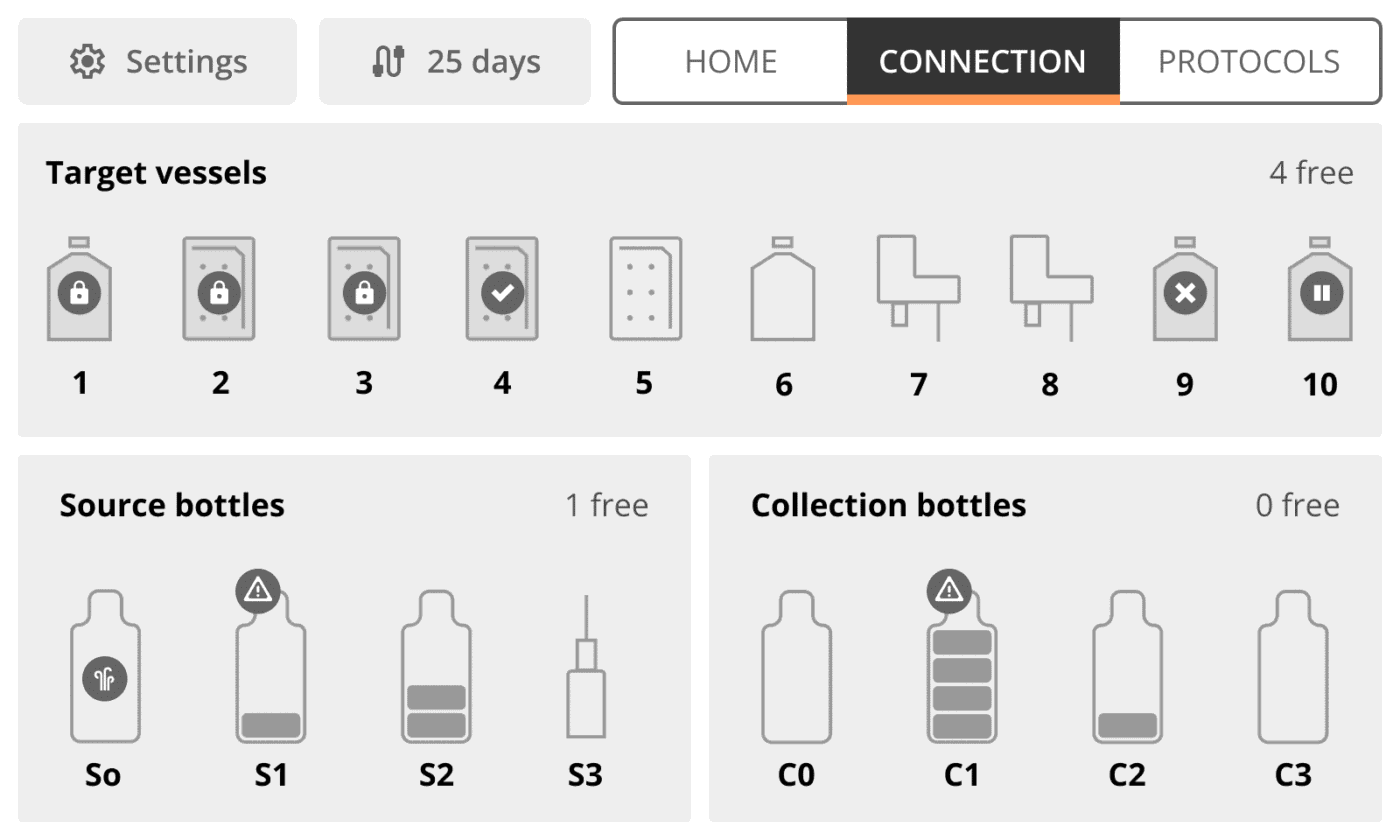 Nestor vous permet de connecter et de contrôler simultanément jusqu’à 10 flasques ou plaques, chacun étant alimenté par un maximum de 4 milieux de culture cellulaire distincts.